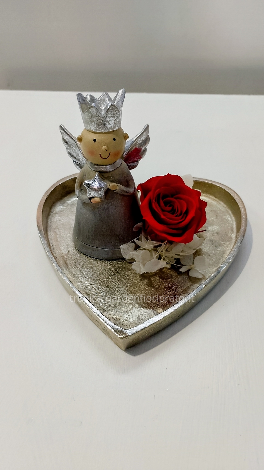 Misure: 16x 12 cm. Angelo ,piattino in argento a forma di cuore. Materiali : ceramica e rose stabilizzate.