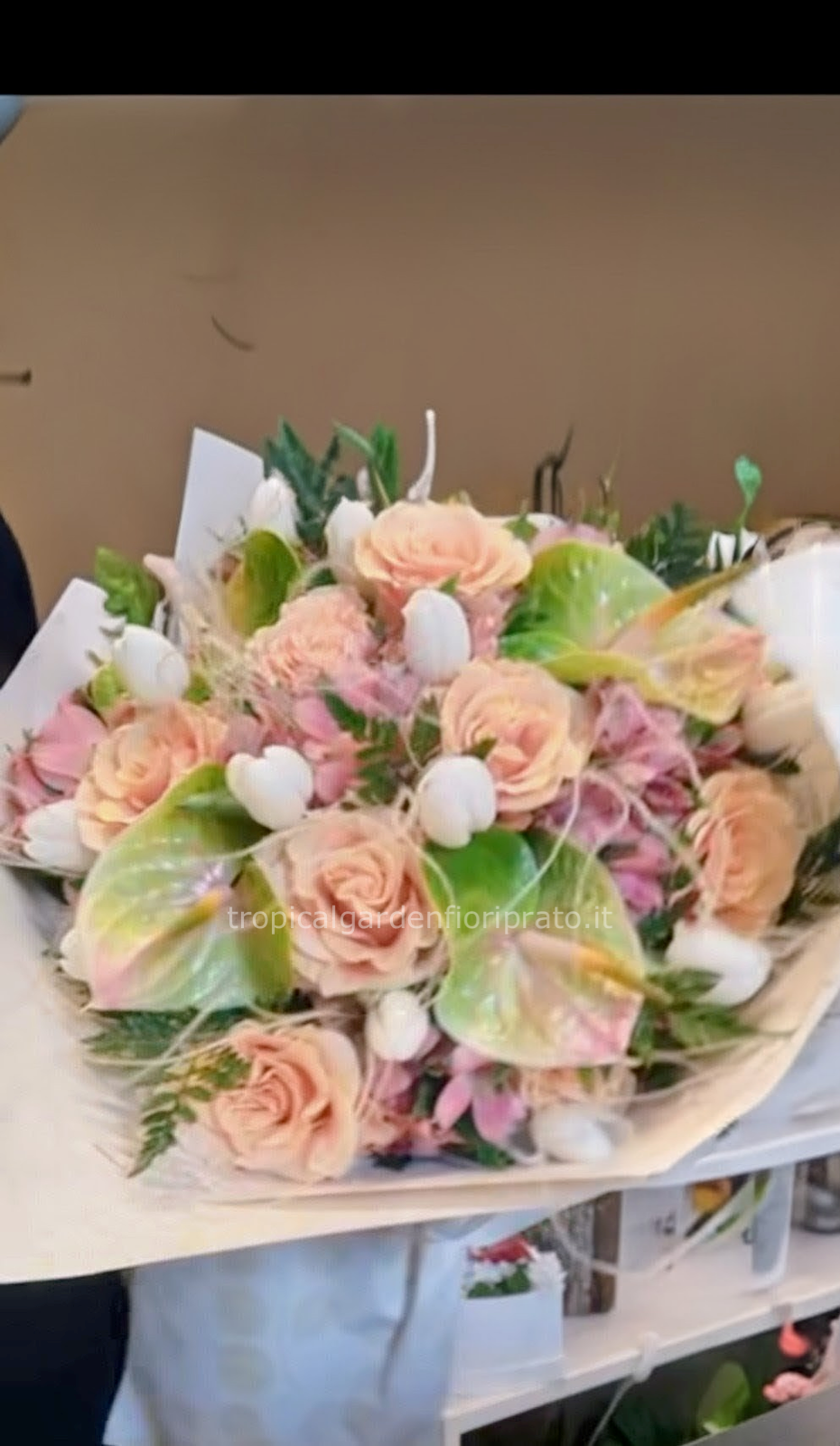 Bouquet elegante con anthurium e rose color pastello