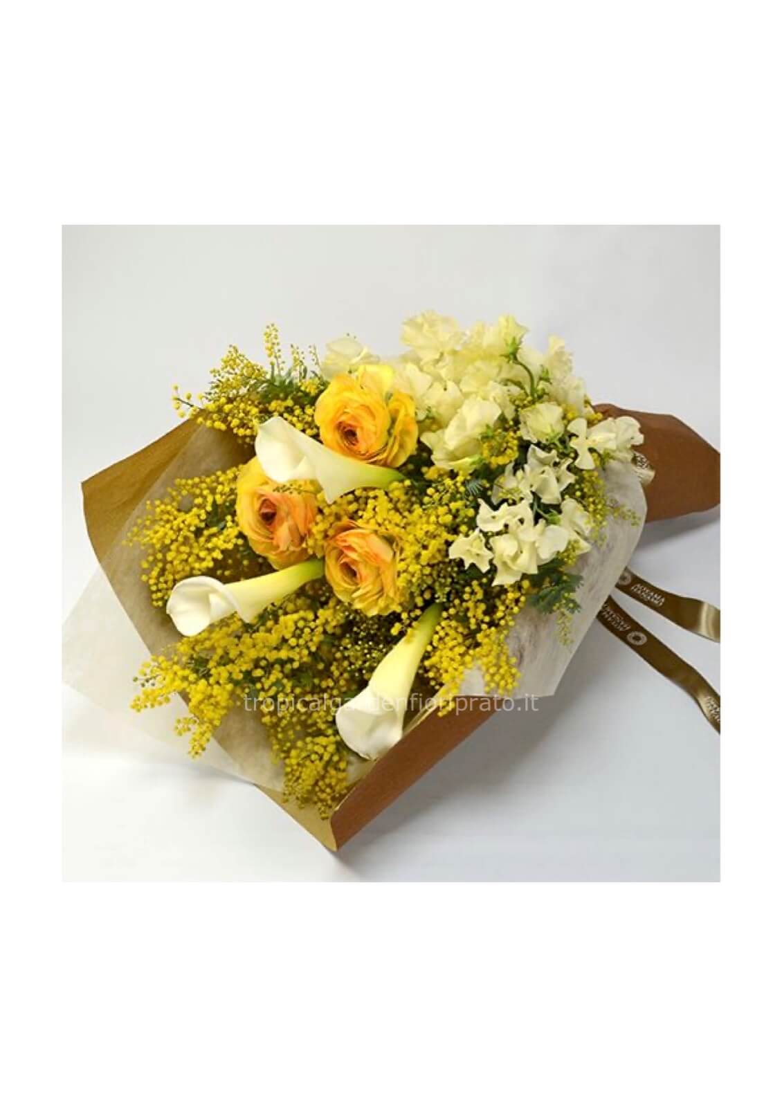 | Bouquet elegante con mimosa, fiori bianchi e gialli Cod. 125157 |