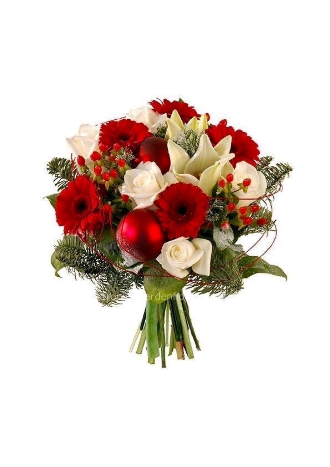Bouquet elegante di fiori misti bianco e rosso con elementi natalizi Cod. 115780 |