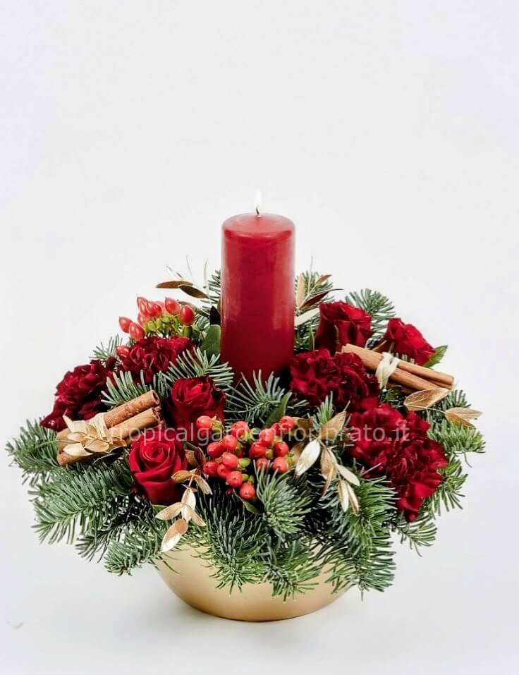 Centro tavola tondo di buone feste con fiori rossi e candela