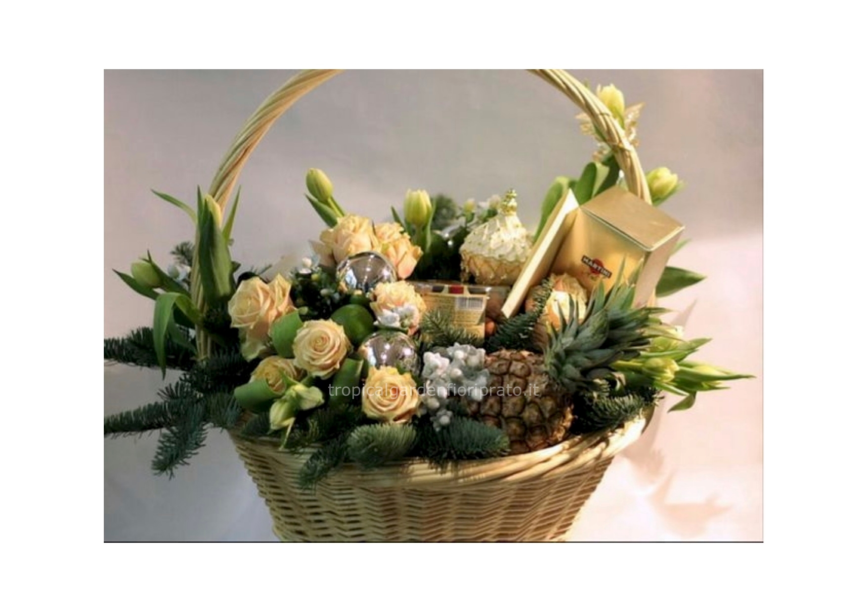 Cesto Natale con fiori, pandoro o panettone, bottiglia, frutta e decorazioni di buone feste