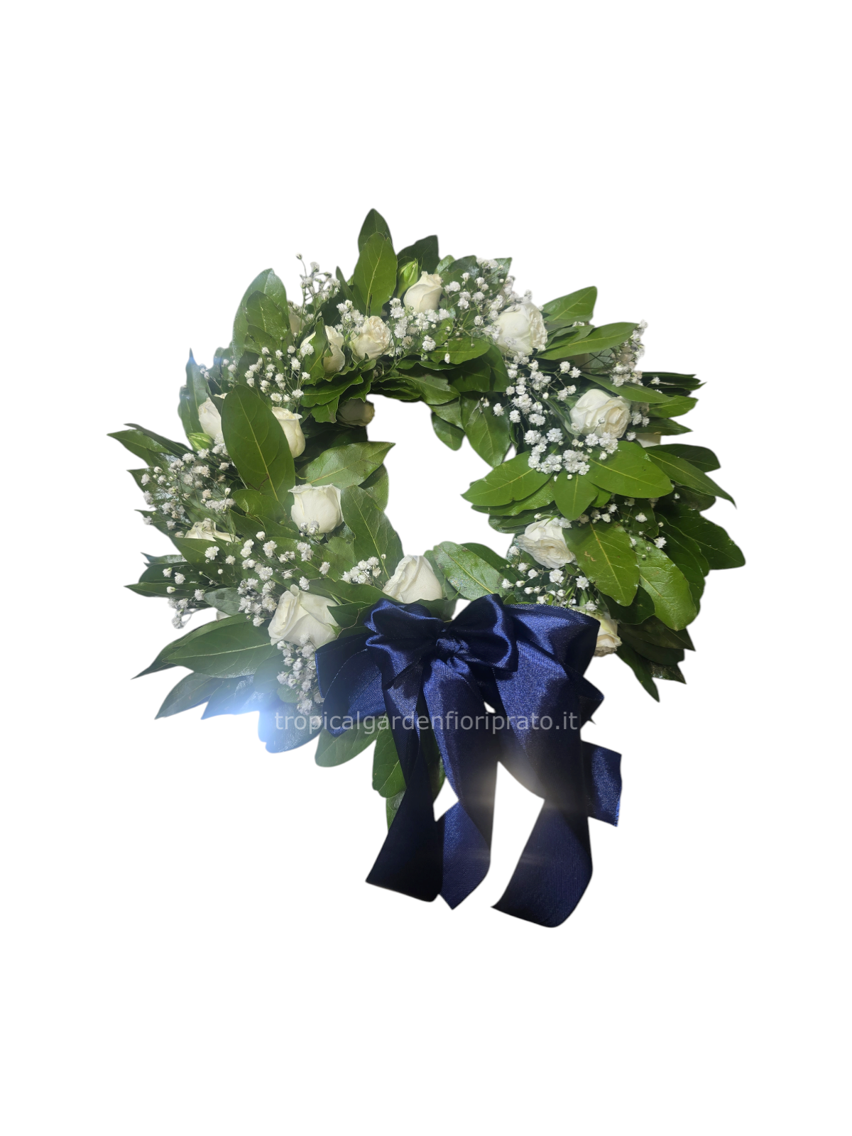 Corona alloro laurea plus con gypsophila, rose bianche e fiocco