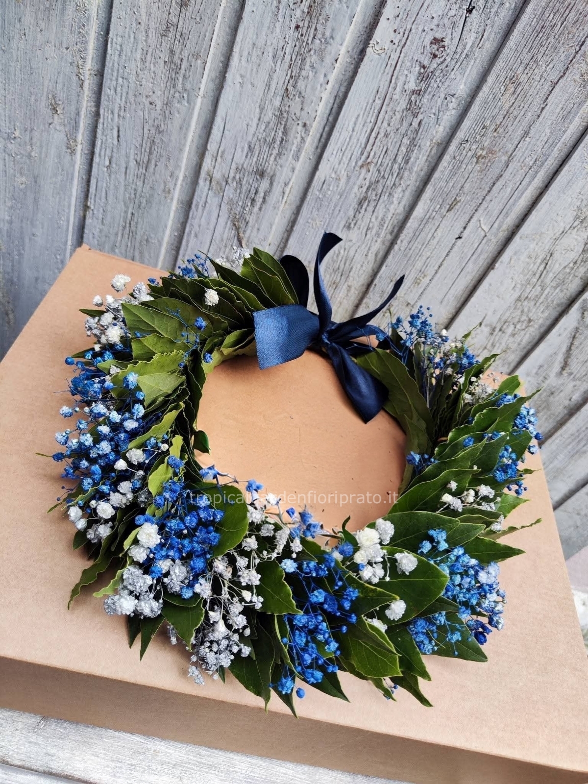 Coroncina alloro laurea con gypsophila bianca ,blu o celeste
