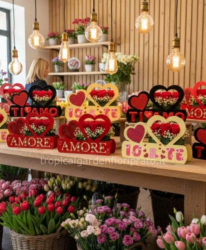 | Flower box media due cuori con 1 rosa, gypsophila e verdi . Cm: 25 x 12 h 16 Cod. 123851 | € 32,00 | Quantità : | |