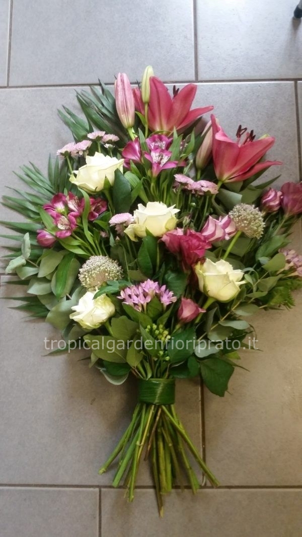 | Mazzo funebre essenziale con lilium e fiori misti bianco e rosa Cod. 116953 | € 45,00 | Quantità : | |