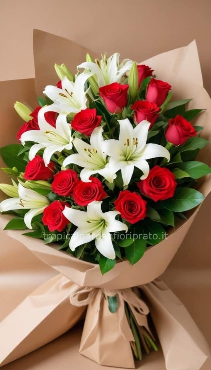 Mazzo lilium bianco e rose rosse a gambo lungo