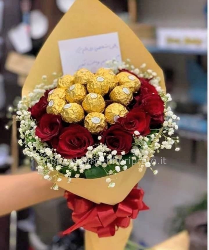 Presso il nostro Fiorista Prato, ogni composizione è pensata per incantare chi la riceve, combinando l'eleganza delle rose rosse con la dolcezza dei Ferrero Rocher e il tocco delicato del gypso.