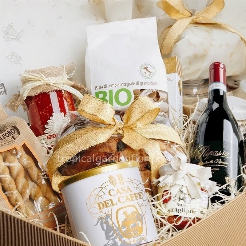Set biologico con dolce, caffè, pasta , vino , vasetto di sugo e sfoglie multicereali